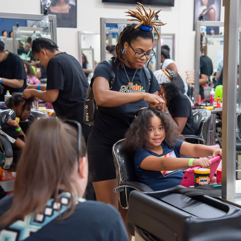 The event offers free textured hair styling services—including braiding and cuts—alongside caregiver education, self-care stations.